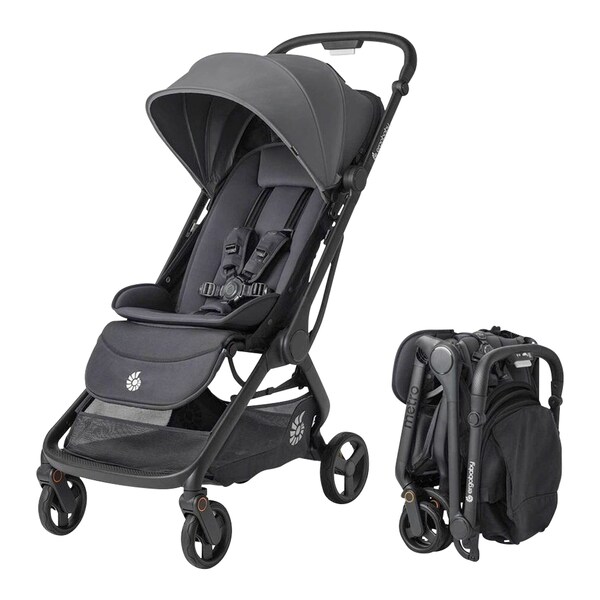 Du kannst den Buggy mit einer Hand kompakt zusammenfalten. So findet er selbst in den meisten Flugzeug-Gepäckfächern Platz. Ein integrierter Tragegriff und eine Faltverriegelung erleichtern Dir den Transport.