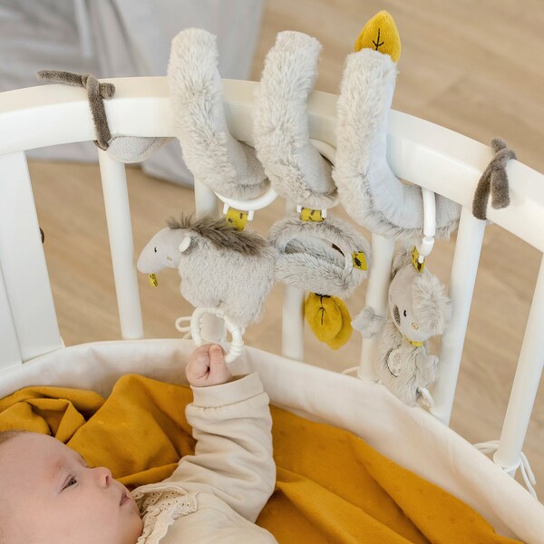 Kuschelweich und mit großem Unterhaltungswert bringt die Activity-Spirale aus der Australia Kollektion von Fehn Babyaugen zum Leuchten.