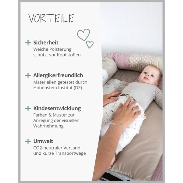 Die Nestchenschlange von Ullenboom überzeugt als Polsterung und Seitenschutz des Baby- oder Beistellbetts. Zuverlässig deckt das weich gefüllte und flexible Design Gitter und Kanten ab und schützt Dein Kind zugleich vor Zugluft.